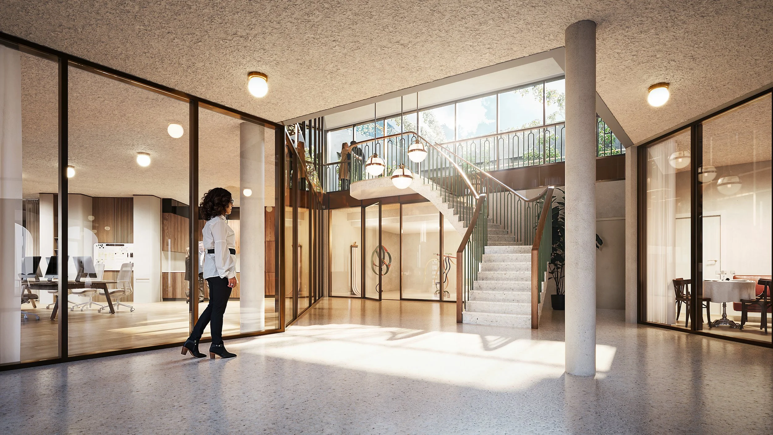 Op het gelijkvloers wordt sterk ingezet op circulatie en toegankelijkheid. Functies zoals fietsenstallingen, afvalbergingen en horecazones worden beter georganiseerd en logisch gepositioneerd. Een centrale, overdekte doorsteek vormt hierbij een belangrijke ruggengraat van het gebouw. Dankzij de openheid en de aanwezigheid van daglicht ontstaat er een aangename, veilige en gebruiksvriendelijke doorgang.