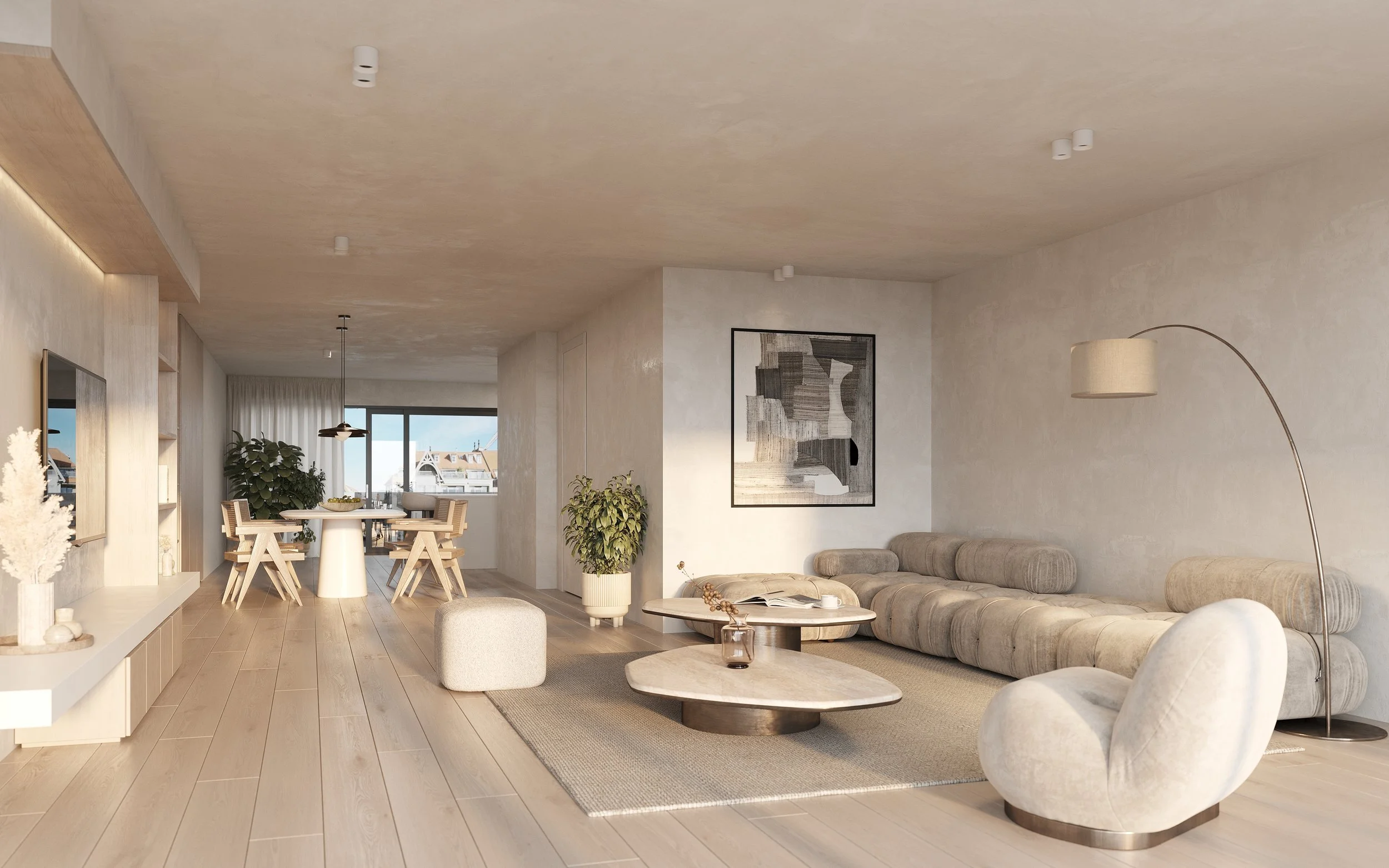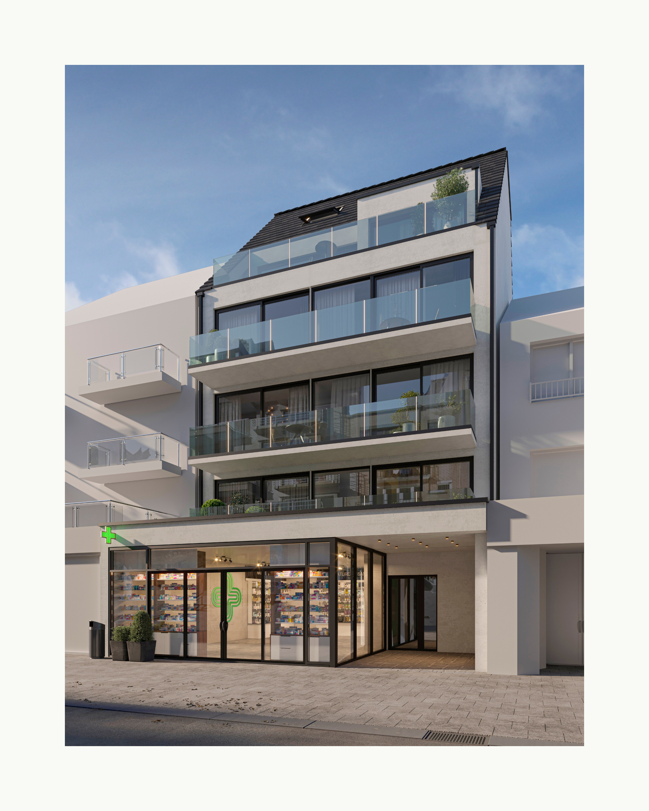 De architecturale uitdrukking wordt gekenmerkt door helderheid en rust. Grote gevelopeningen en doorlopende terrassen over de breedte van de gevel versterken de relatie tussen binnen en buiten en brengen licht en openheid in de woonruimtes. De materialisatie blijft ingetogen: een lichte gevelafwerking in combinatie met donker schrijnwerk en transparante balustrades creëert een subtiel contrast dat het volume leesbaar houdt zonder dominant te worden. Zo ontwikkelt het project zich als een discrete maar duidelijke ingreep in de Zeelaan, een hedendaagse interpretatie van stedelijk wonen die inzet op continuïteit, bewoonbaarheid en de versterking van het straatleven.